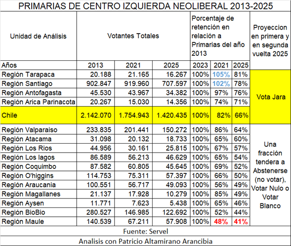 En las regiones mencionadas se puede proyectar que un segmento importante de los votantes de la CENTRO IZQUIERDA NEOLIBERAL se irá a la Abstención, Nulo o Blanco, debilitando la posibilidad de una victoria de Jara.