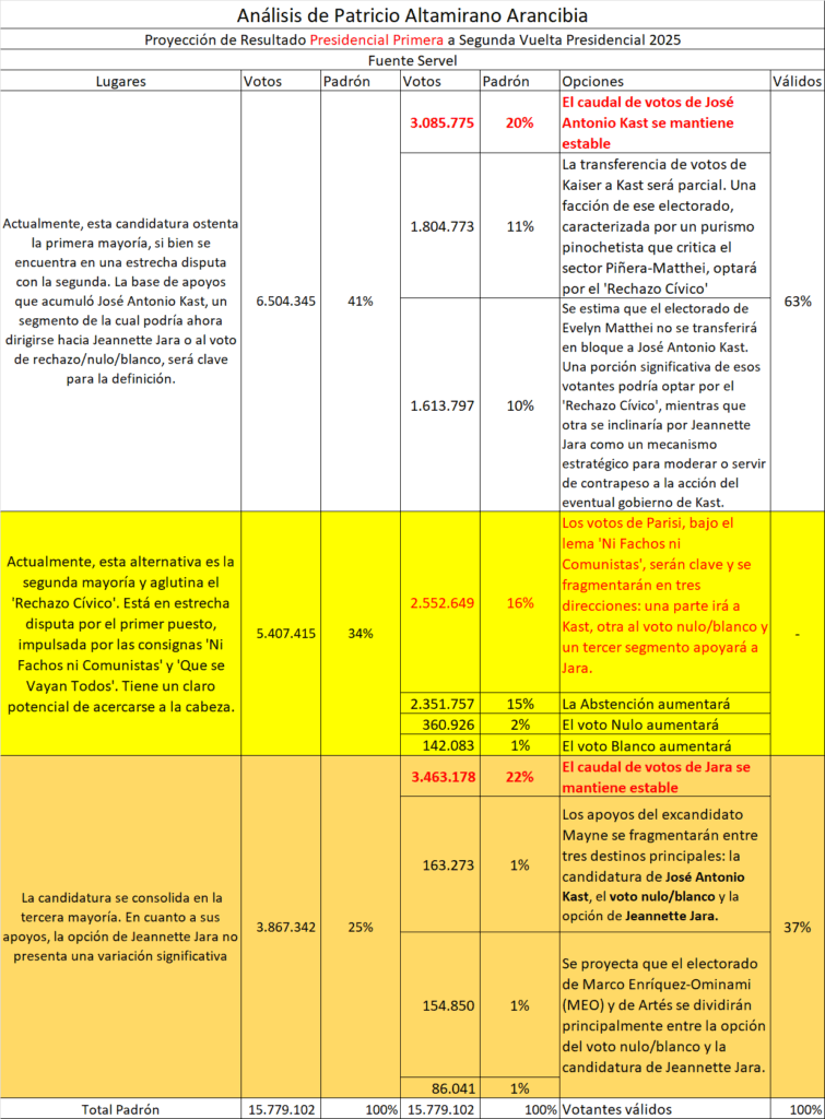 Este análisis mecánico proyecta el traspaso de votos desde la Primera a la Segunda Vuelta Presidencial de 2025. El panorama electoral chileno se mantiene estructuralmente estable, con cambios sociales mínimos entre noviembre y diciembre. Los ajustes estratégicos de las campañas de Jara y Kast se basan en el resultado inicial, y el modelo proyecta que la votación del excandidato Parisi se inclina principalmente hacia el «Rechazo Cívico» . Bajo este escenario, José Antonio Kast mantendría la ventaja , sin depender decisivamente de la división de votos.