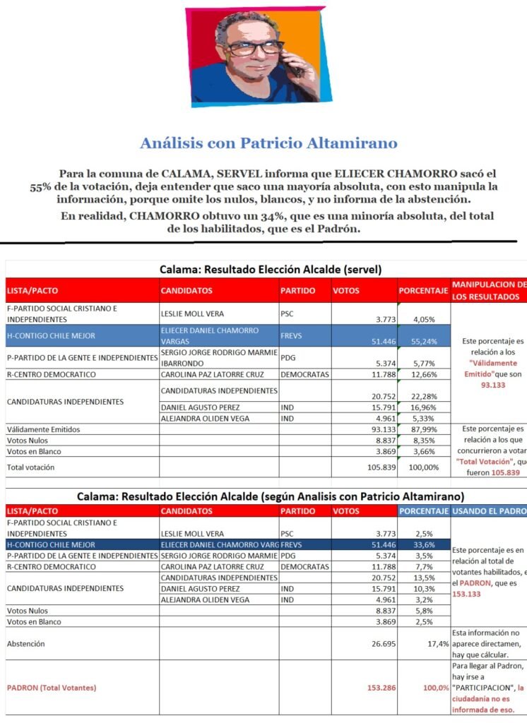 Compruebe como ciudadanía de CALAMA al informarse por el SERVEL cree que actual ELICIER CHAMARRO obtuvo 55%, pero en realidad fue un 34%. Solicite la situación de su comuna a patricio.comentariopolitico@gmail.com”
