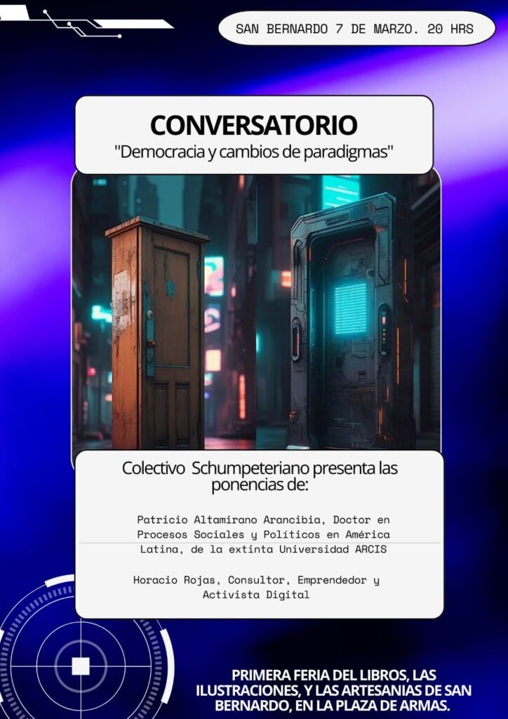 Este viernes 7 de marzo a la 20:00, en la PRIMERA FERIA DEL LIBROS, LAS ILUSTRACIONES, Y LAS ARTESANIAS DE SAN BERNARDO, en la PLAZA DE ARMAS.El Colectivo Schumpeteriano presenta las ponencias• “El Algoritmo de la Ciudadanía: Democracia y cambios de paradigmas”, de Horacio Rojas, Consultor, Emprendedor y Activista Digital. • “La Ciudadanía se enfrenta