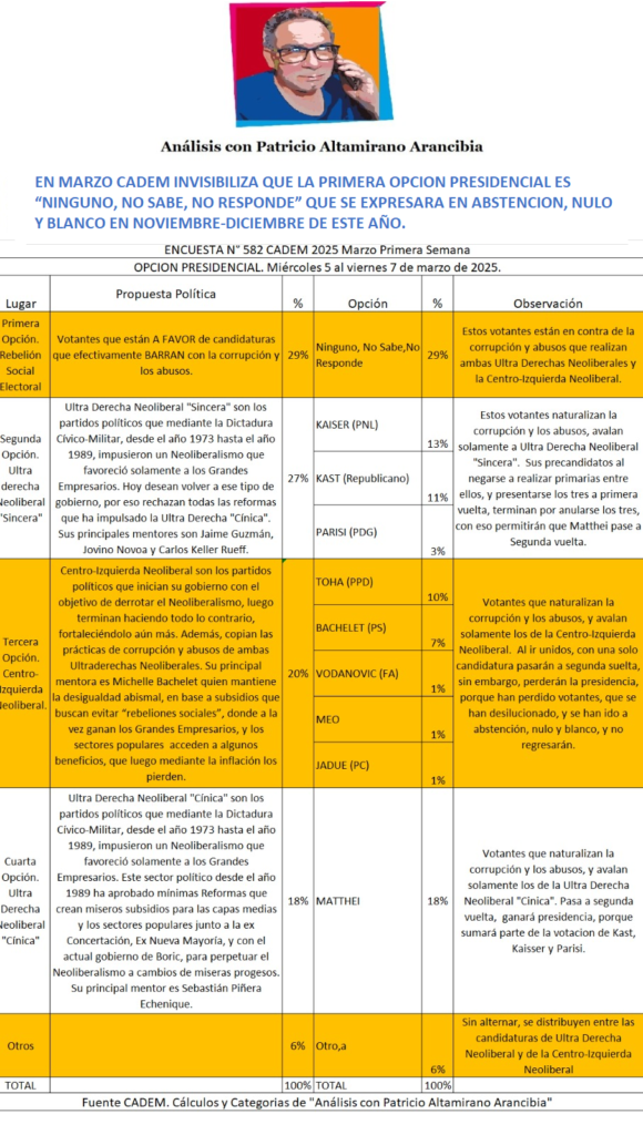EN MARZO CADEM INVISIBILIZA QUE LA PRIMERA OPCIÓN PRESIDENCIAL ES “NINGUNO, NO SABE, NO RESPONDE” QUE SE EXPRESARA EN ABSTENCIÓN, NULO Y BLANCO EN NOVIEMBRE-DICIEMBRE DE ESTA AÑO.